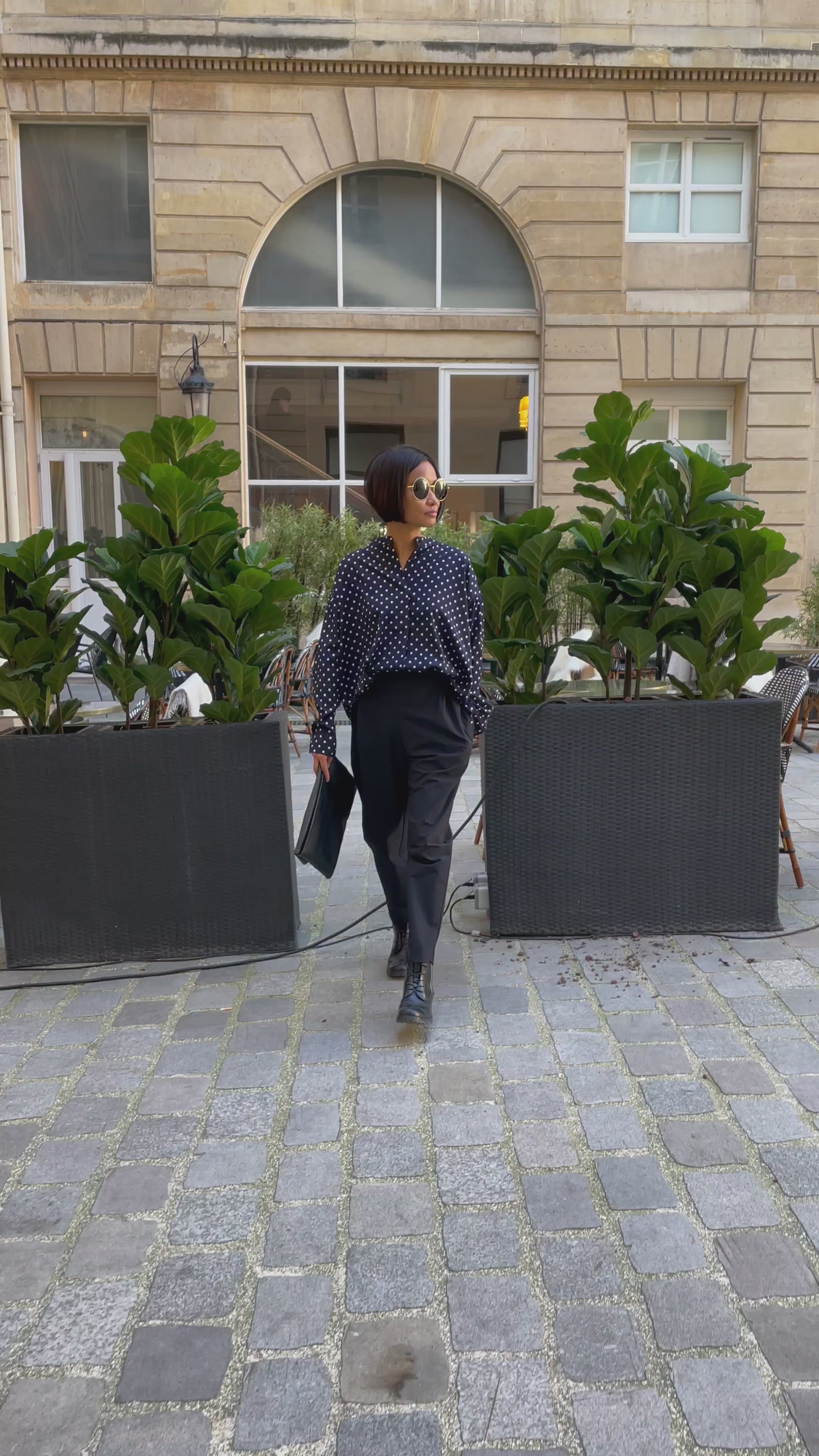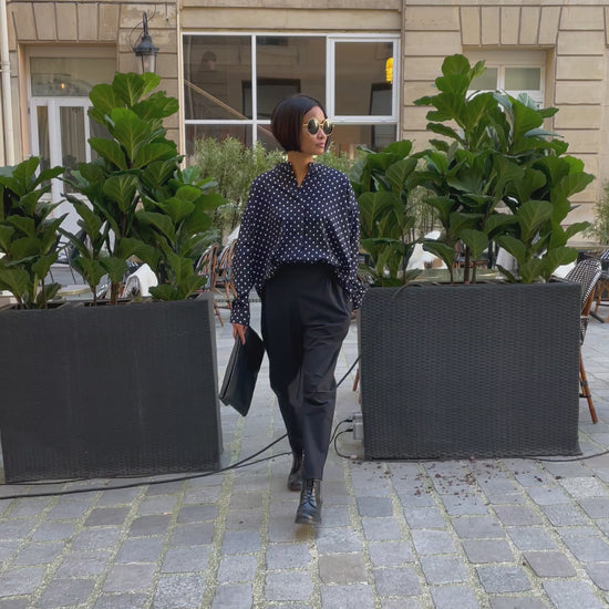 This white polka dot shirt is appealing thanks to its chic yet relaxed style. Its loose fit offers a fluid and comfortable silhouette, ideal for effortlessly elegant wear. Made from a lightweight, flowing fabric, it moves naturally with you and drapes beautifully. The dropped shoulders add a modern, effortless touch.