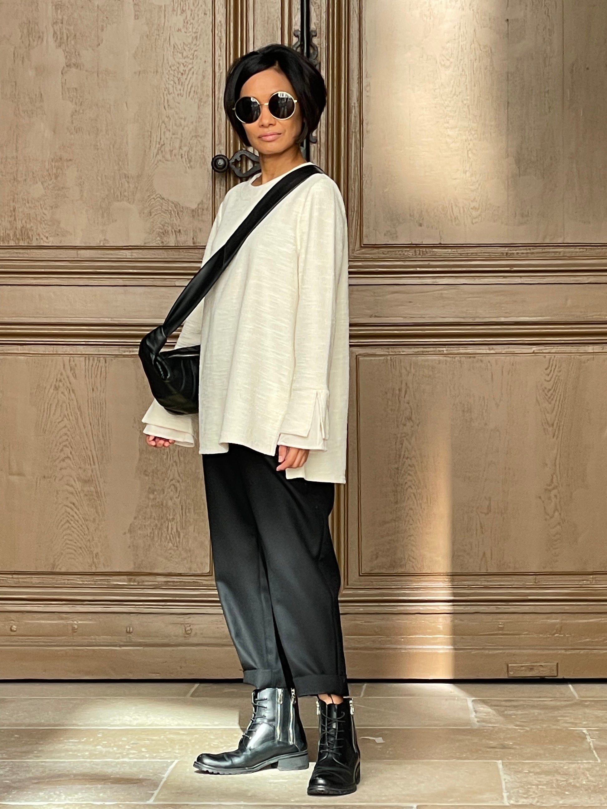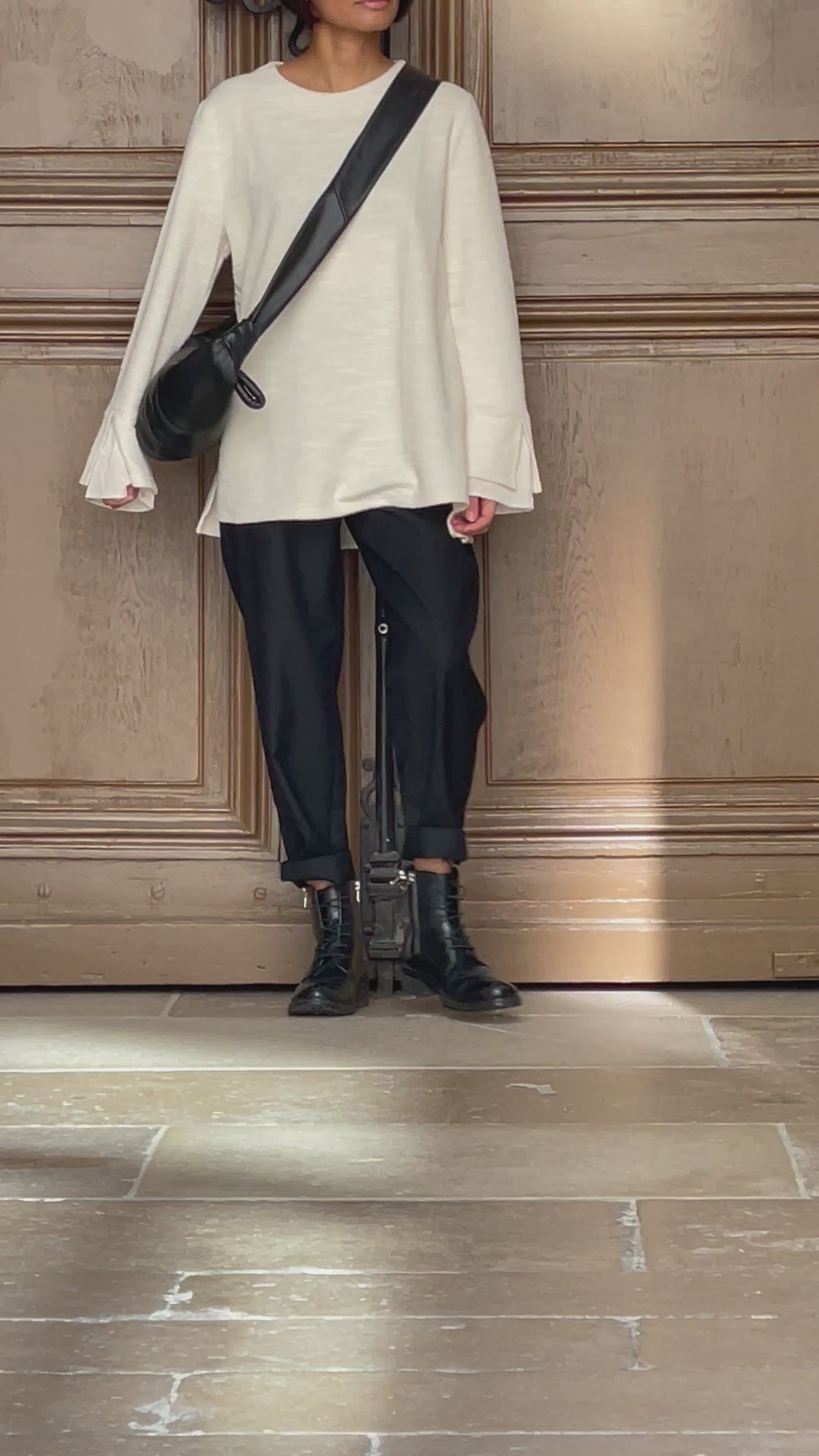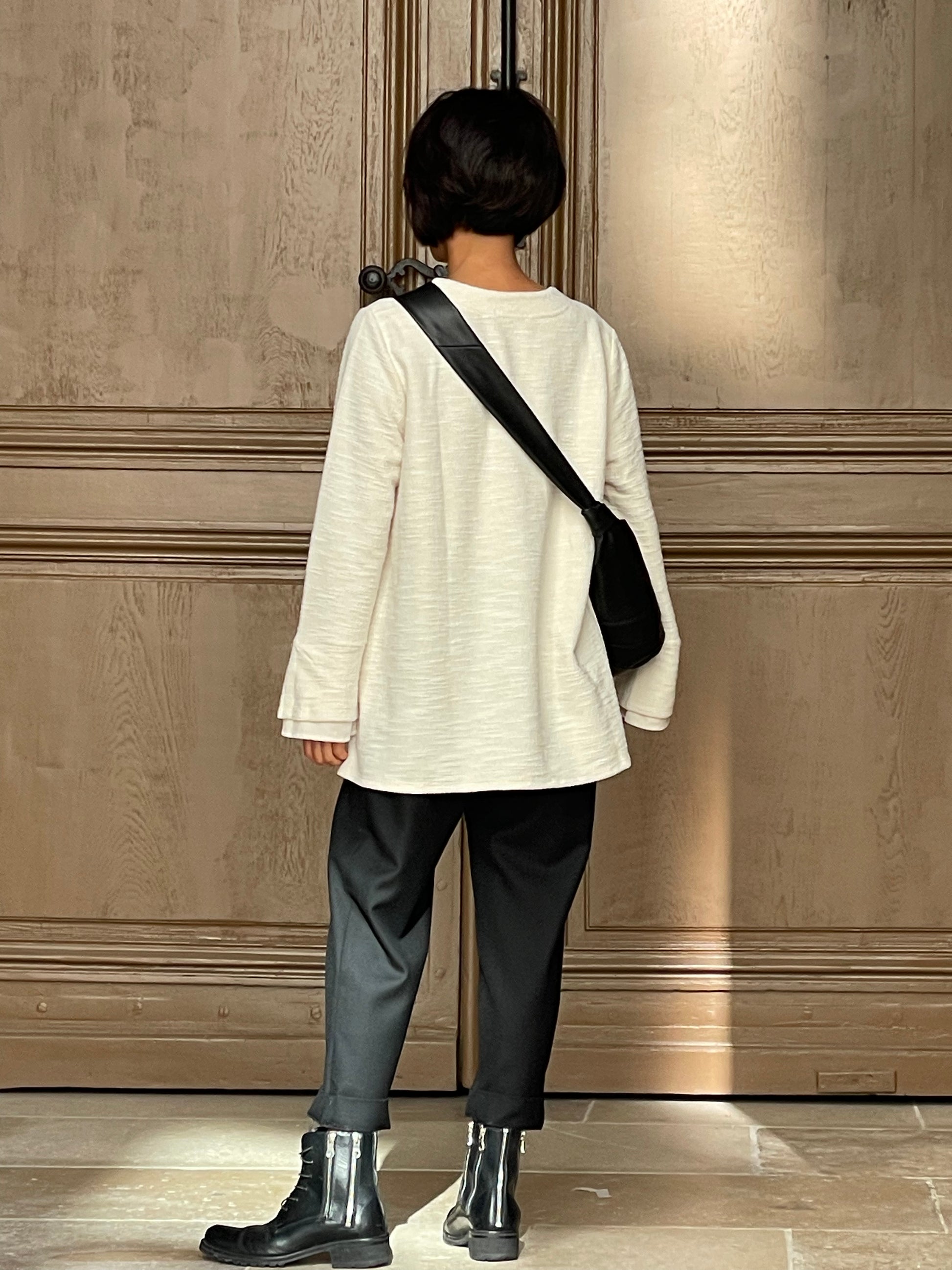 Its loose fit and slightly flared sleeves bring a modern and refined touch to your everyday looks.