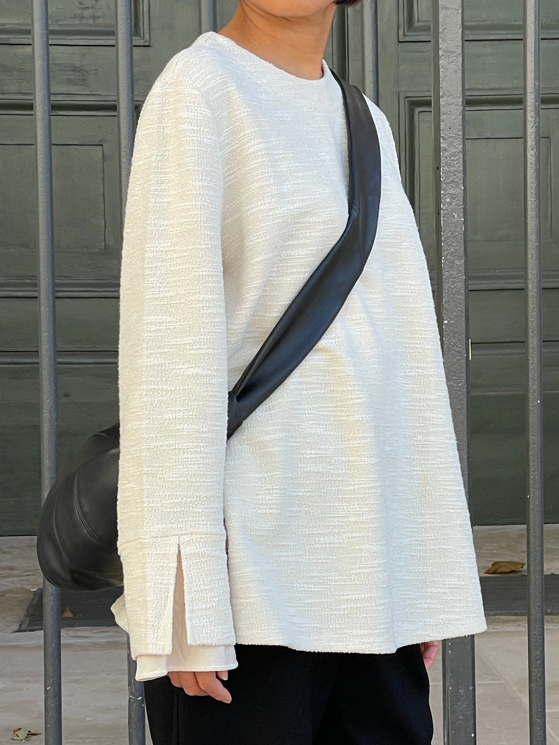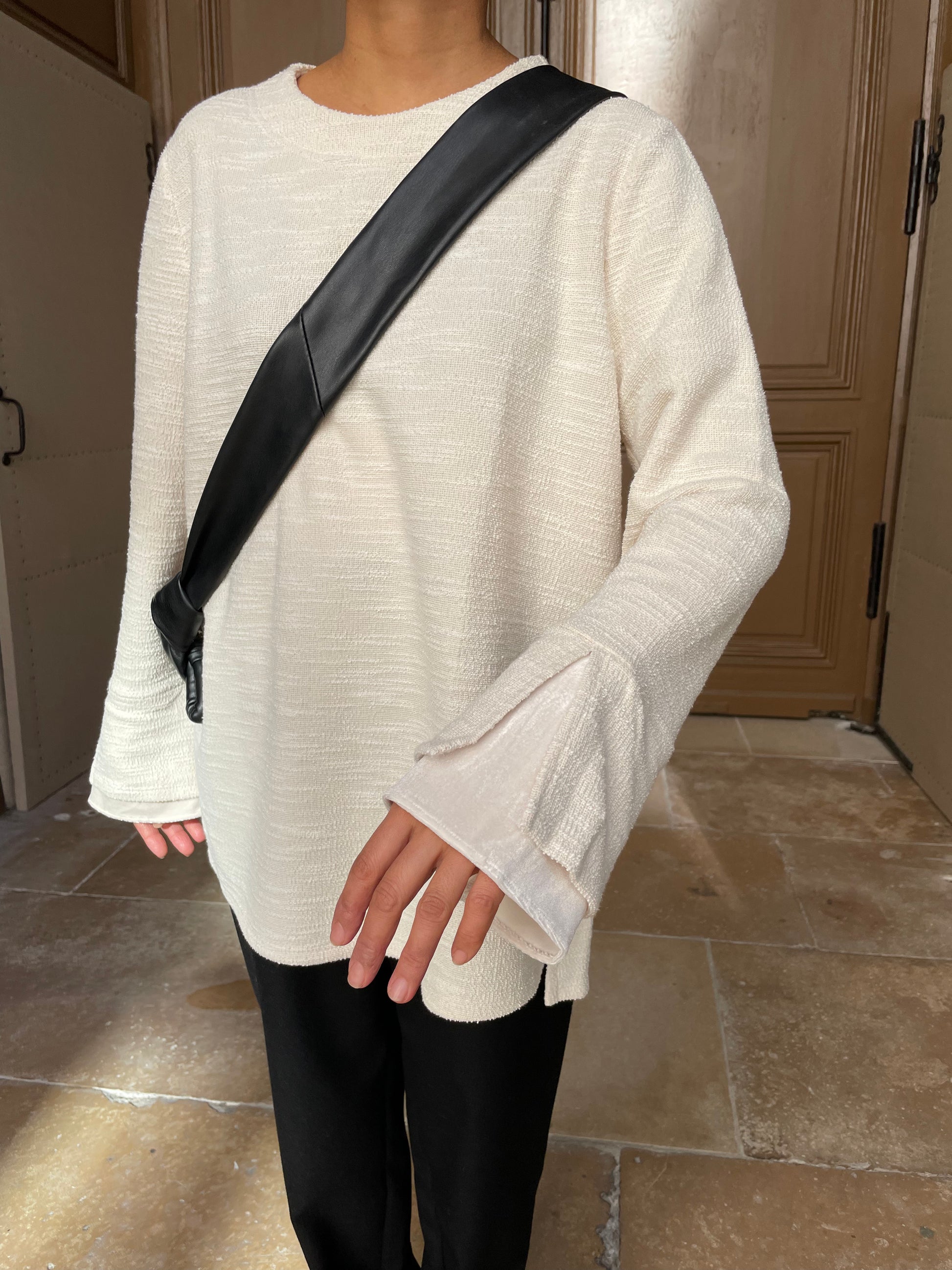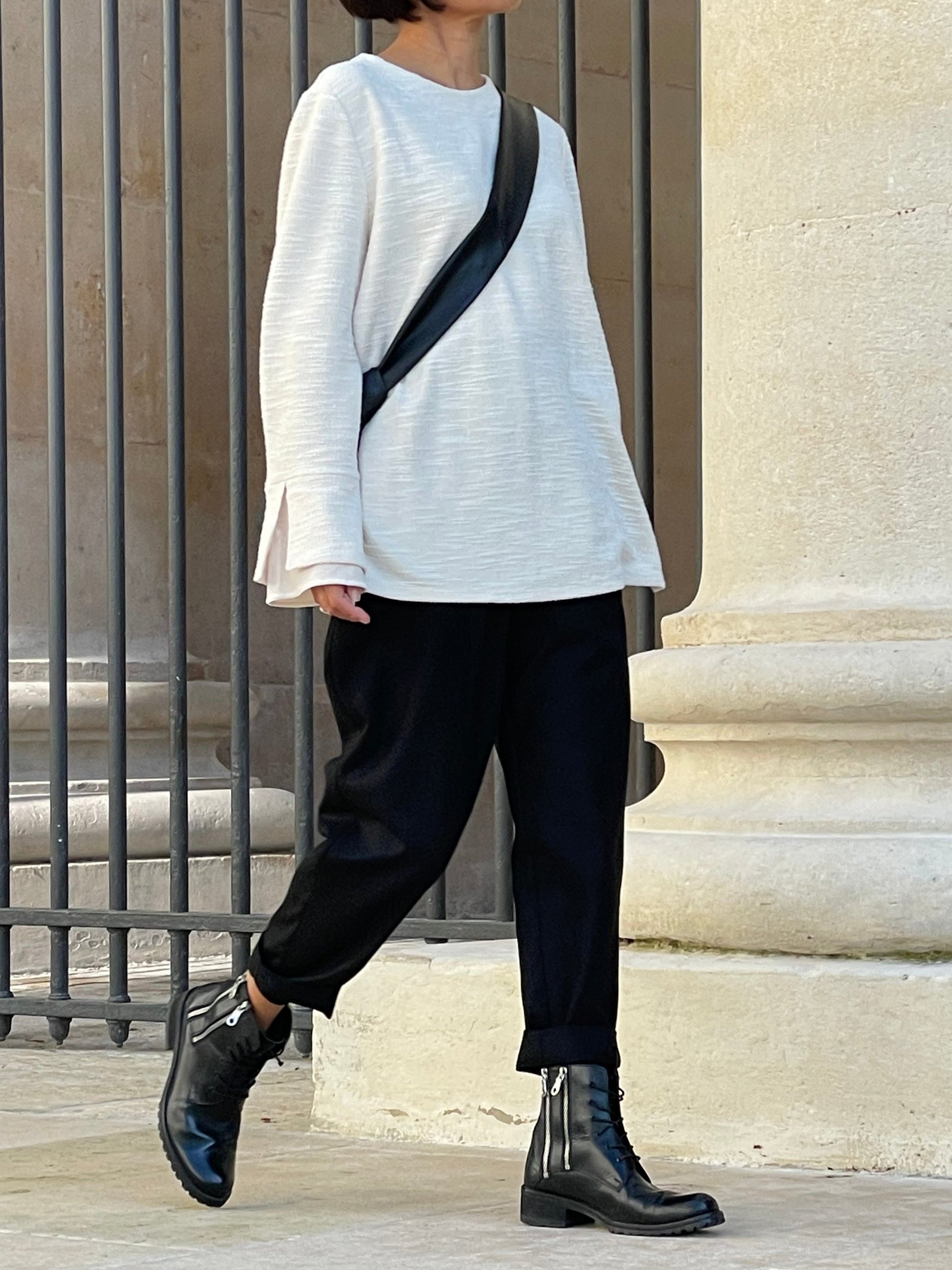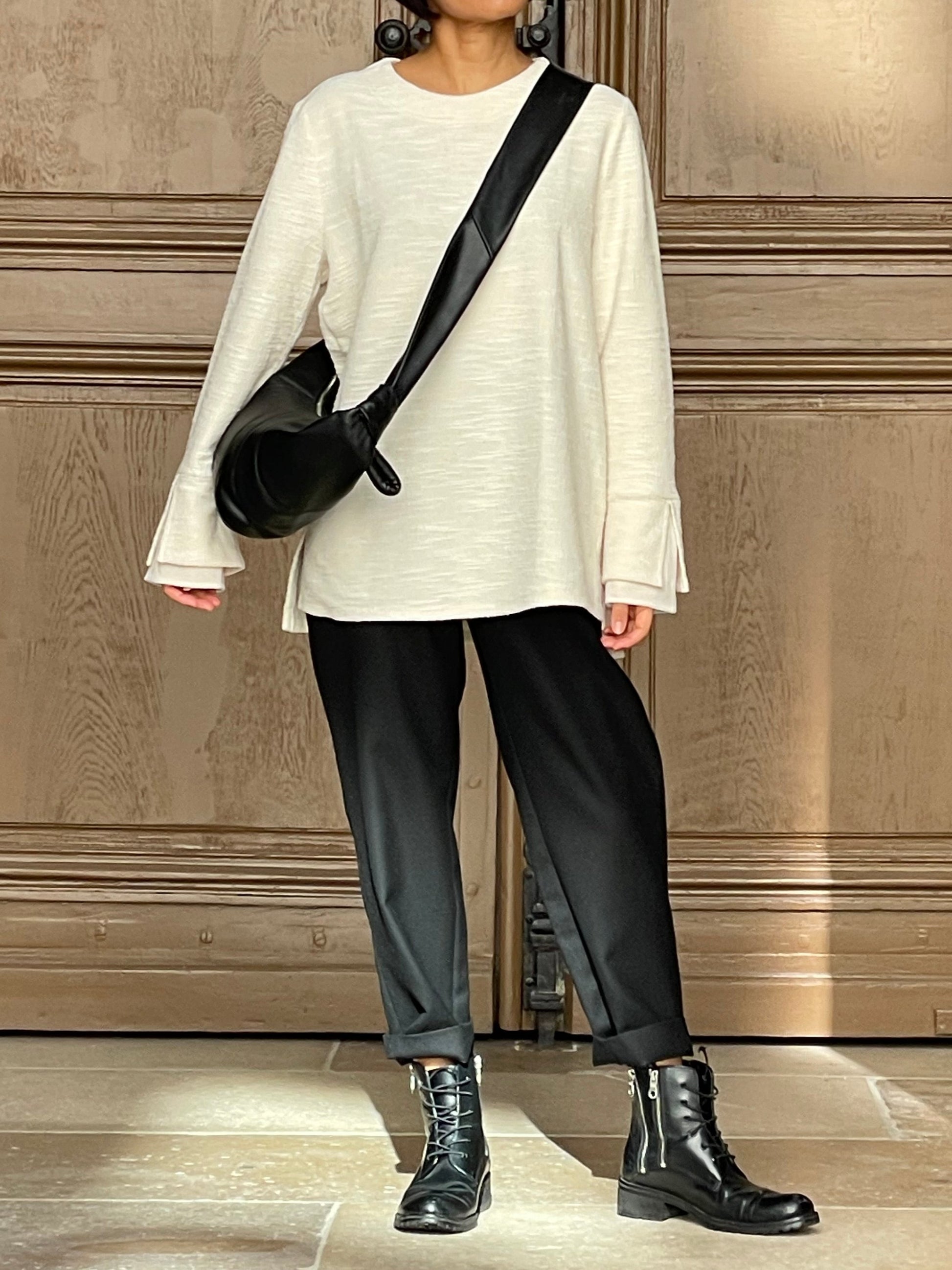 Its loose fit and slightly flared sleeves bring a modern and refined touch to your everyday looks.