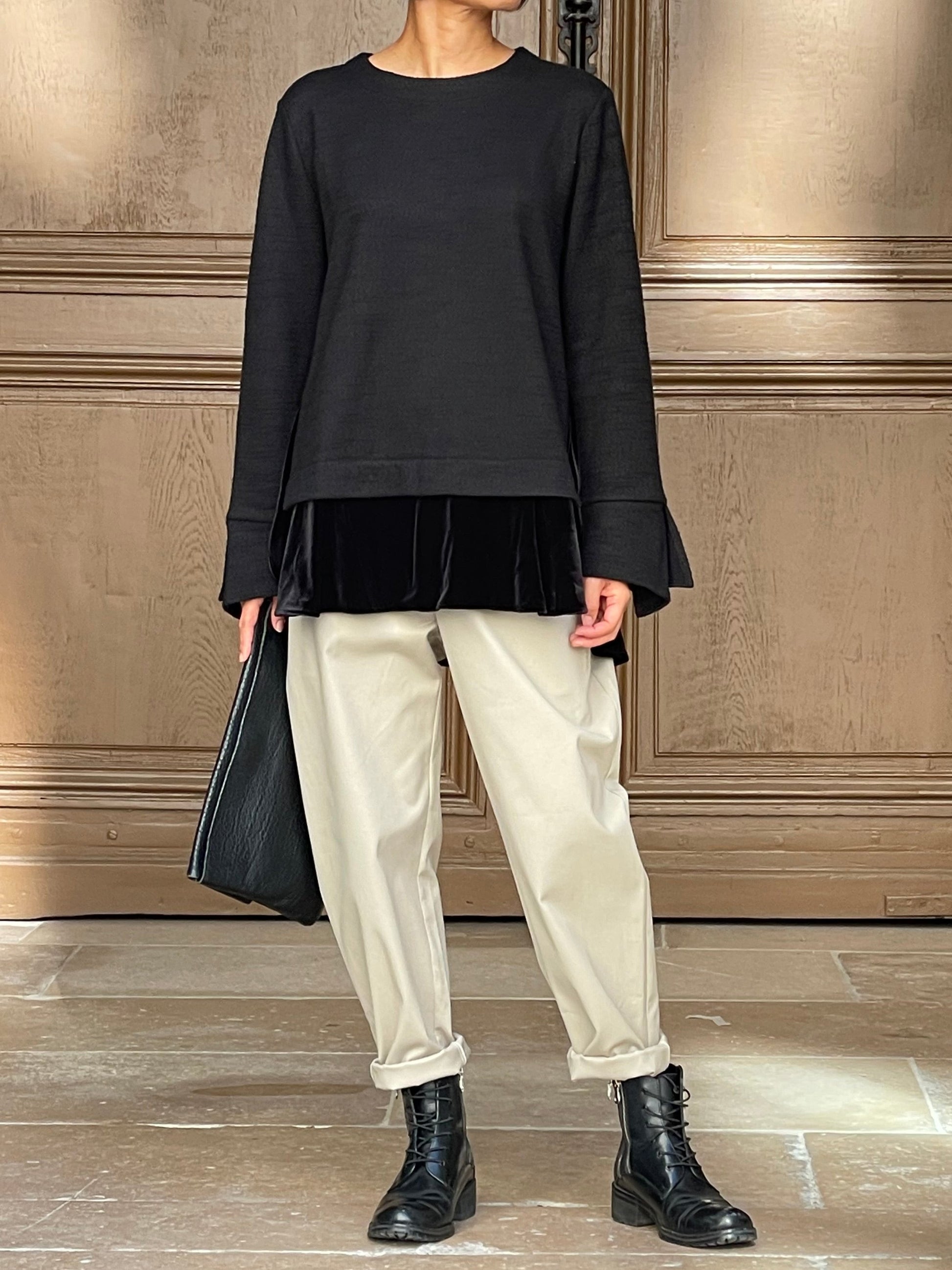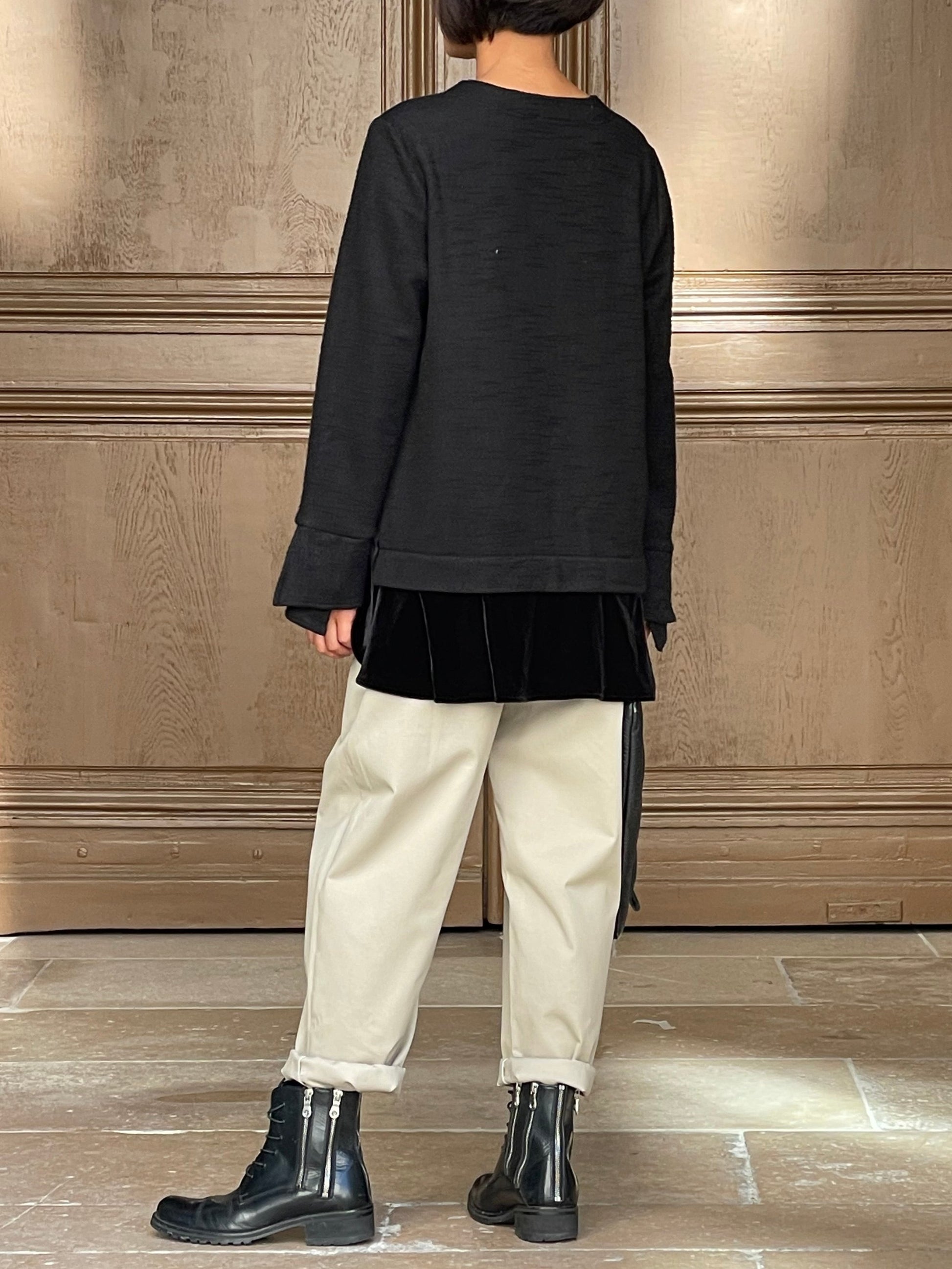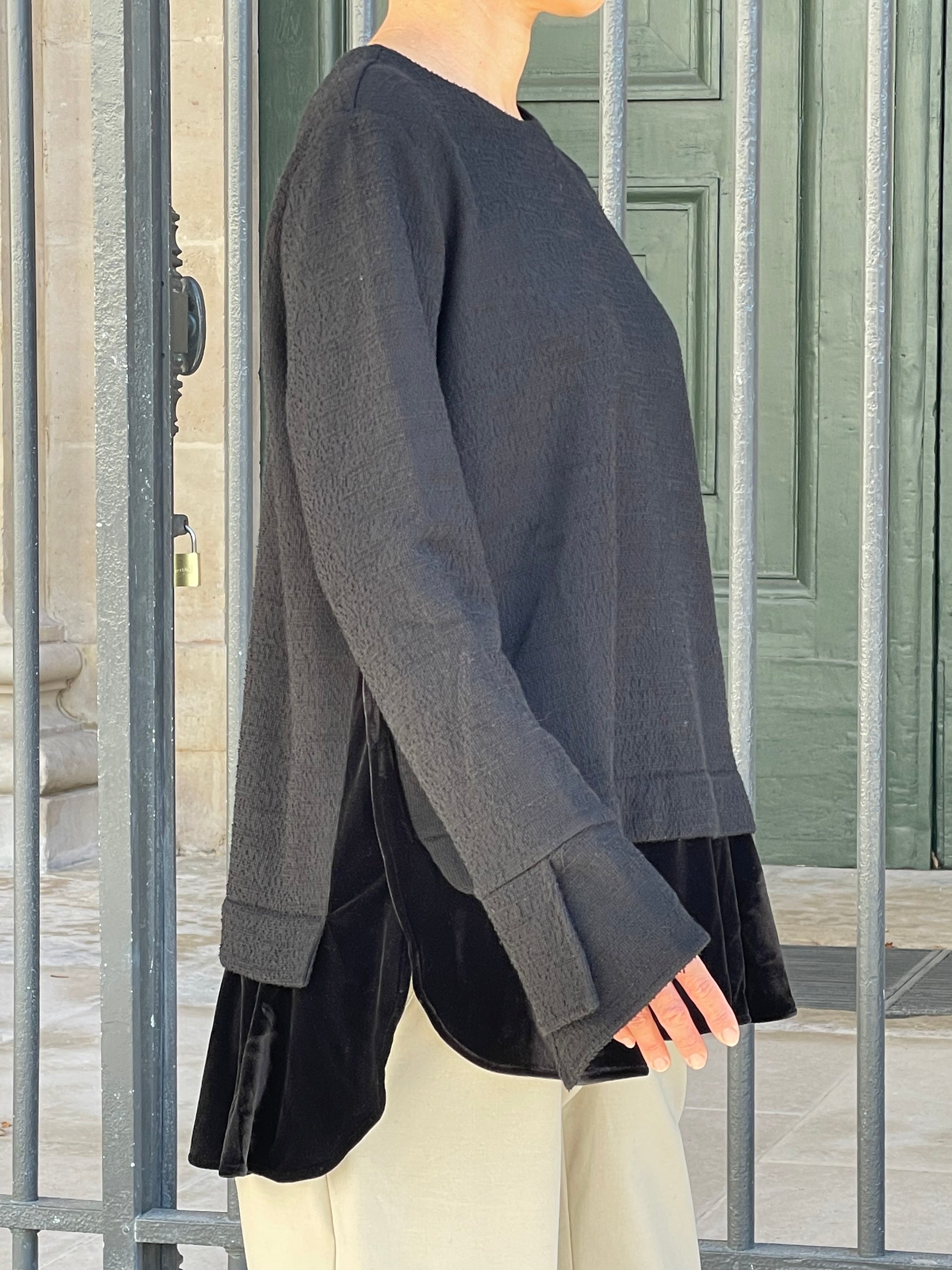 A contemporary and timeless piece that brings out the urban minimalist spirit. Woven velvet on the sleeves.