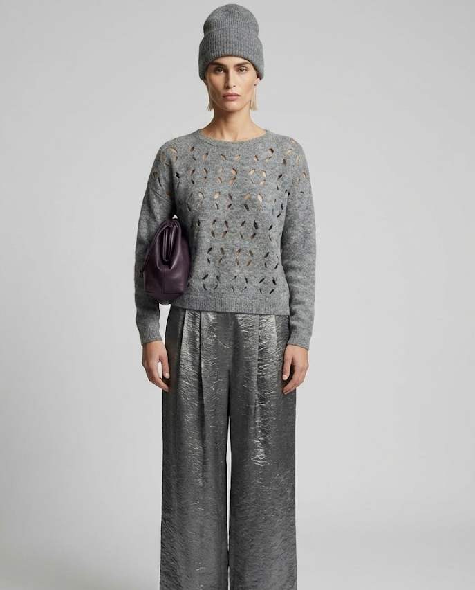 Heather grey sweater in soft, stretchy alpaca wool. It features a unique openwork pattern on the front. It has an oversized fit with a boat neck and narrow sleeves.