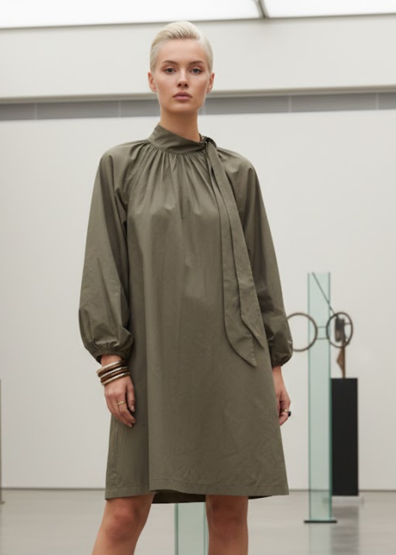 Make a bold statement with this black taffeta A-line dress, both bold and refined. Its loose, flowing cut hugs your body with ease, while the structured fabric adds character to the silhouette. The gathered collar adorned with a delicate bow adds a romantic touch, contrasted by the puffed raglan sleeves and elasticated cuffs for controlled volume.