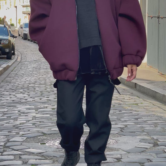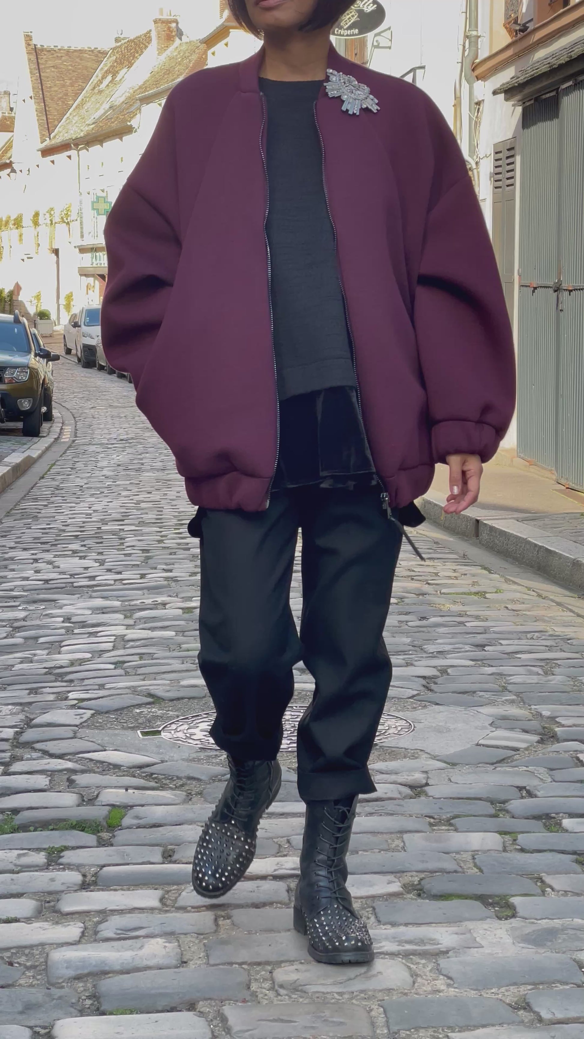 Ce blouson bordeaux oversize revisite les codes du style avec audace. Sa coupe structurée, ses finitions soignées et son détail broche en font une pièce forte, pensée pour sublimer toutes les silhouettes. Porté en ville ou dans un décor épuré, il incarne une mode contemporaine et expressive.