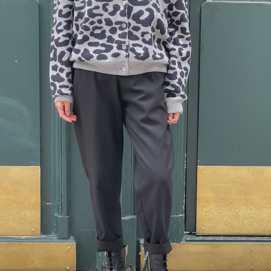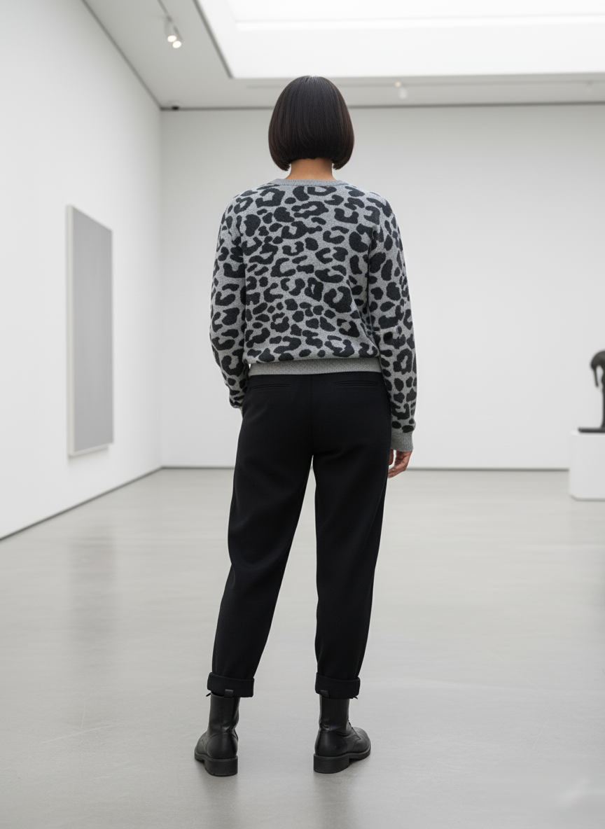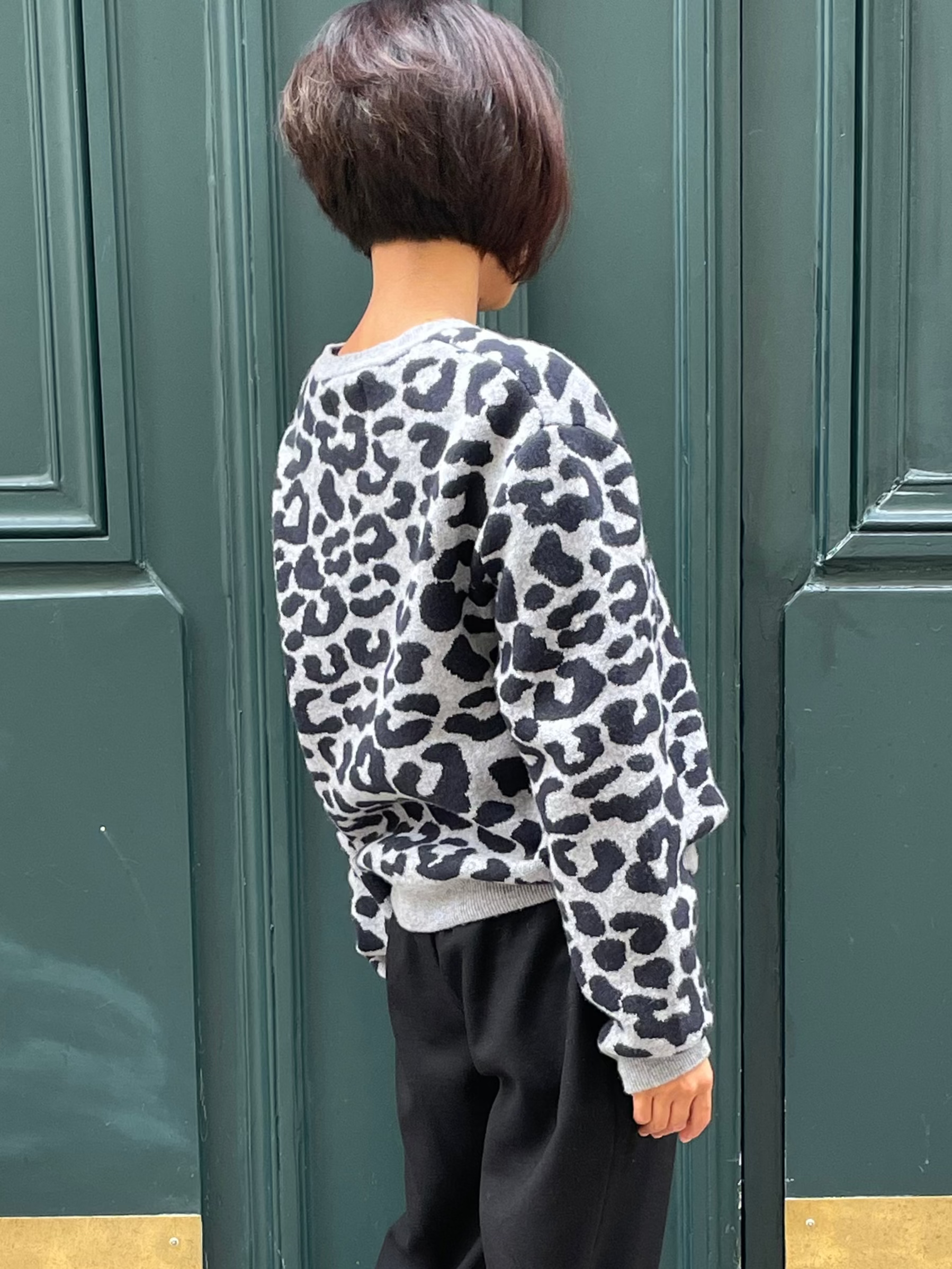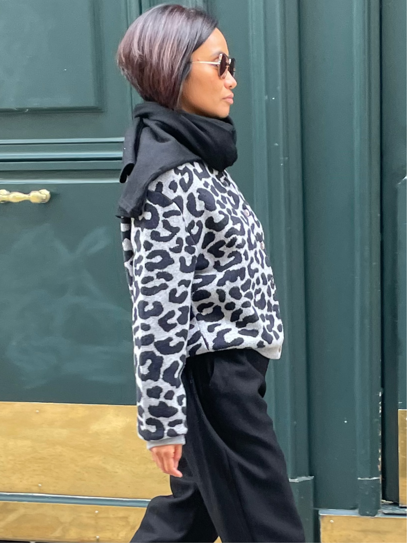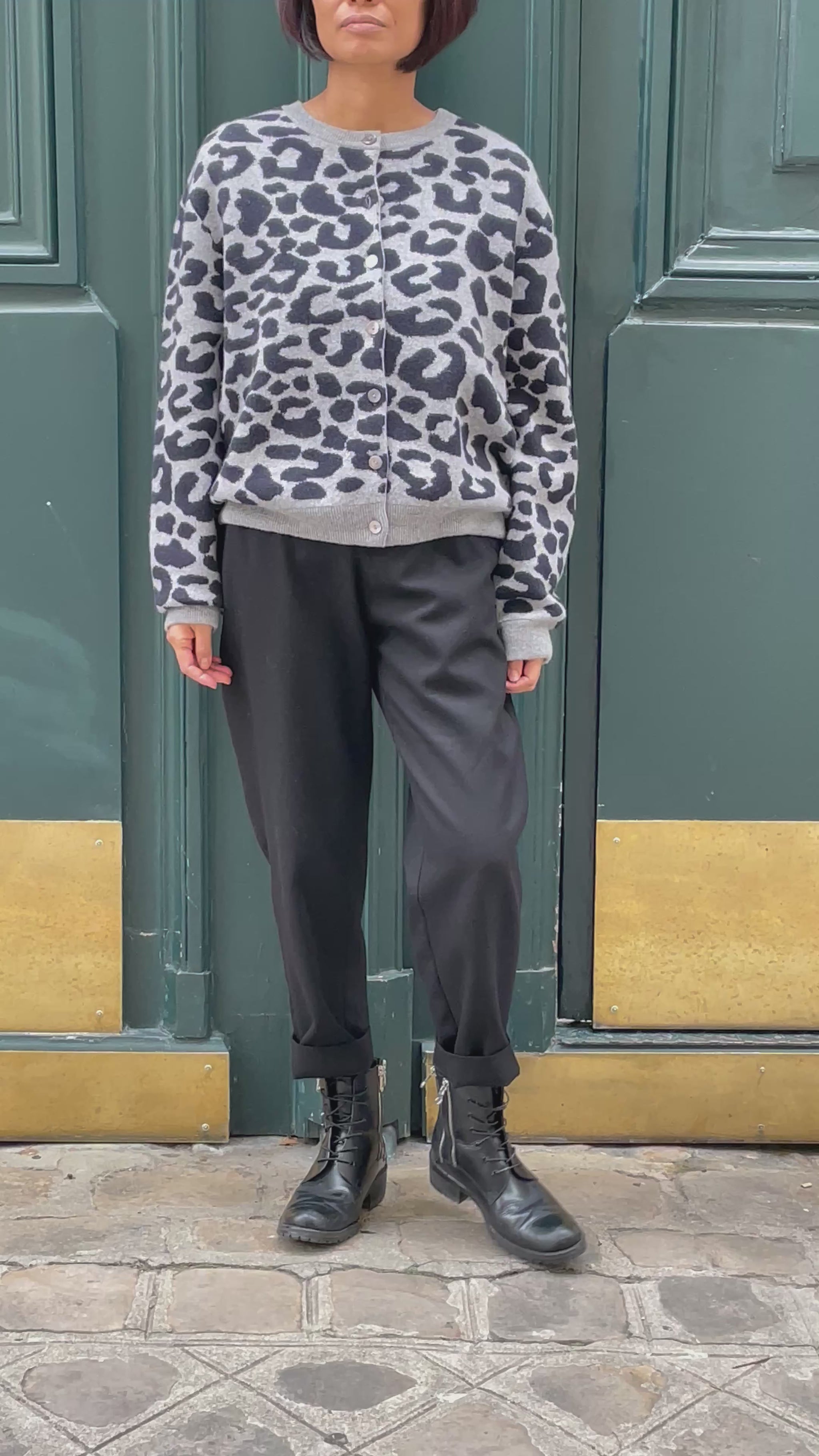 Chic et confortable, ce cardigan ras du cou en 100 % laine mérinos allie chaleur, douceur et style. Son motif léopard graphique en gris moyen et bleu marine apporte une touche contemporaine et audacieuse à une pièce classique.
