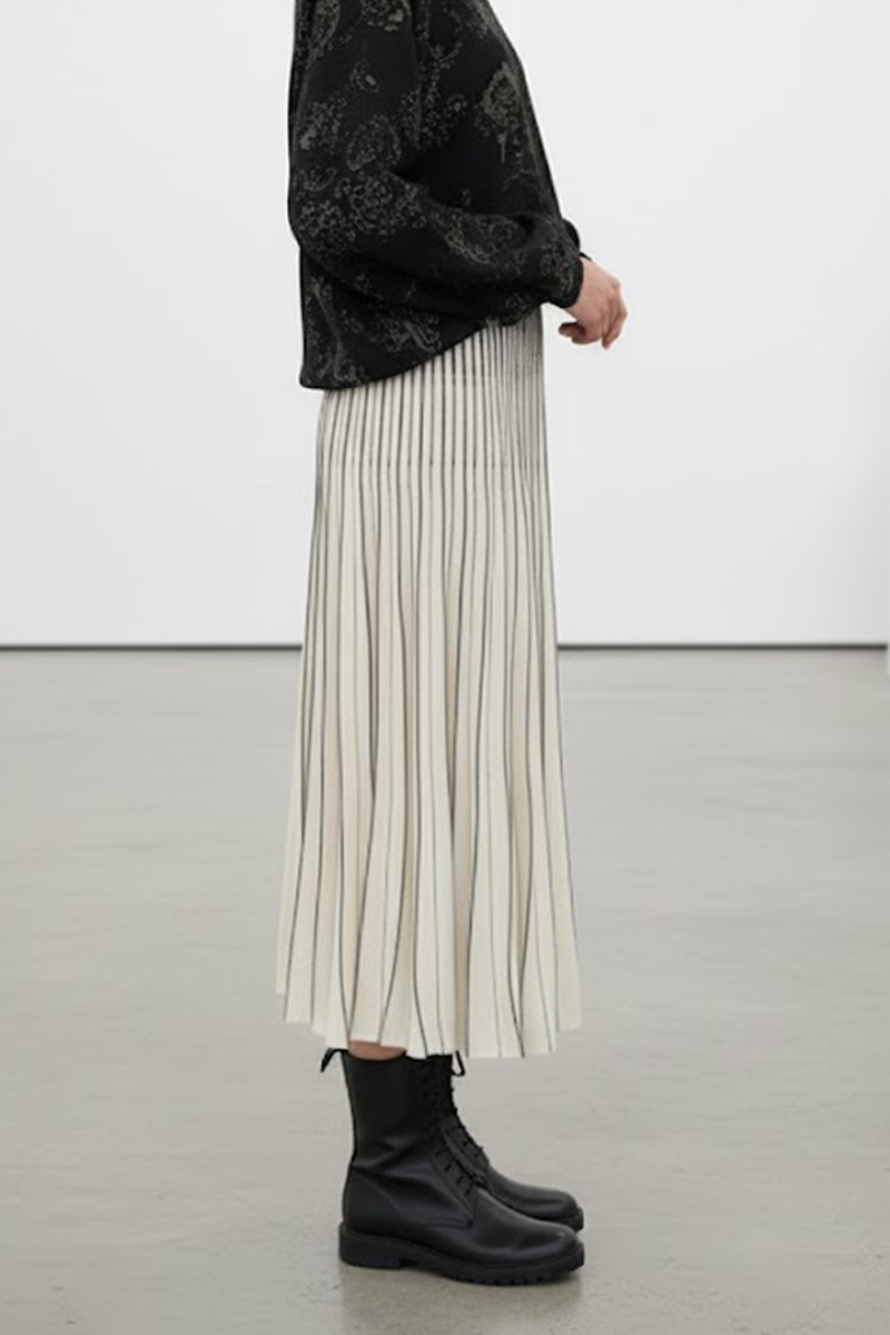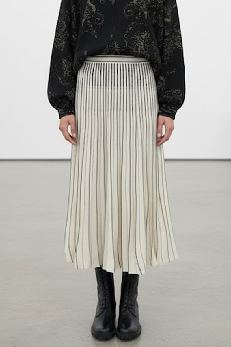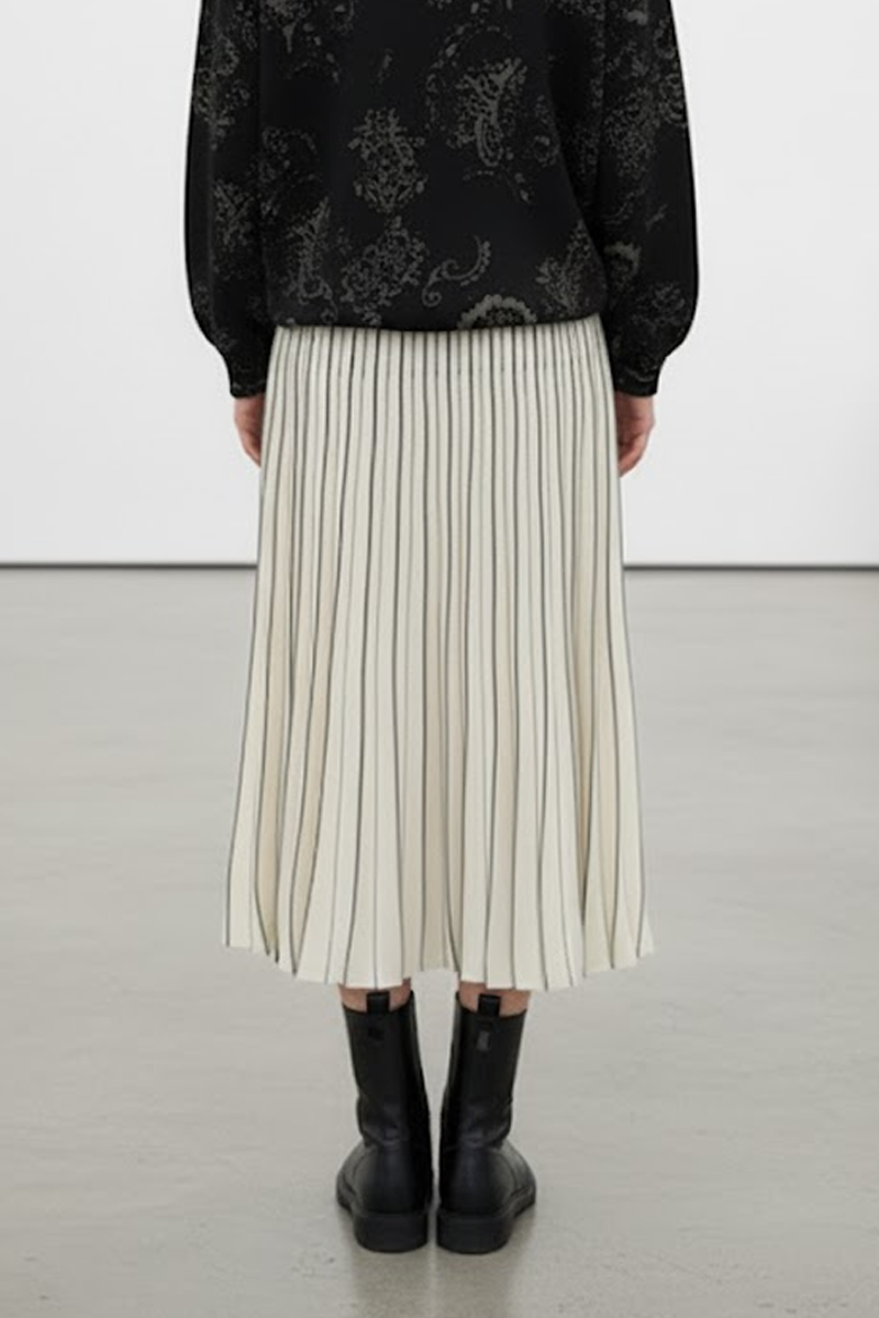 Son plissé délicat apporte du mouvement et de la légèreté, tandis que sa coupe midi flatte toutes les morphologies. Parfaite pour les journées fraîches, elle se porte aussi bien avec des bottes hautes qu’avec des escarpins pour une allure plus citadine.