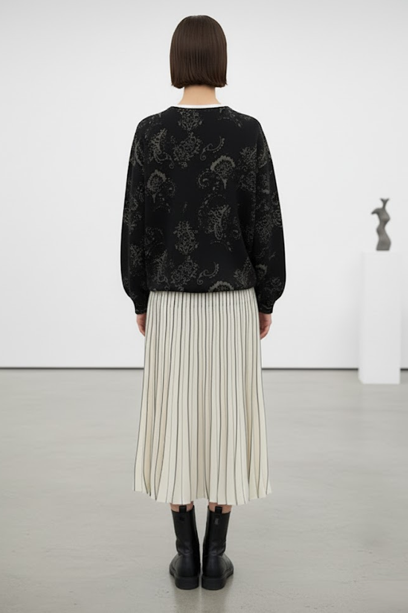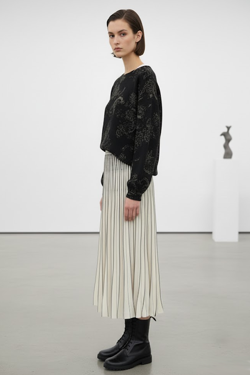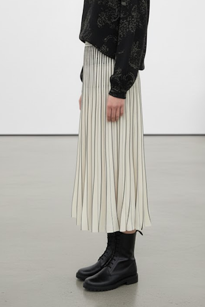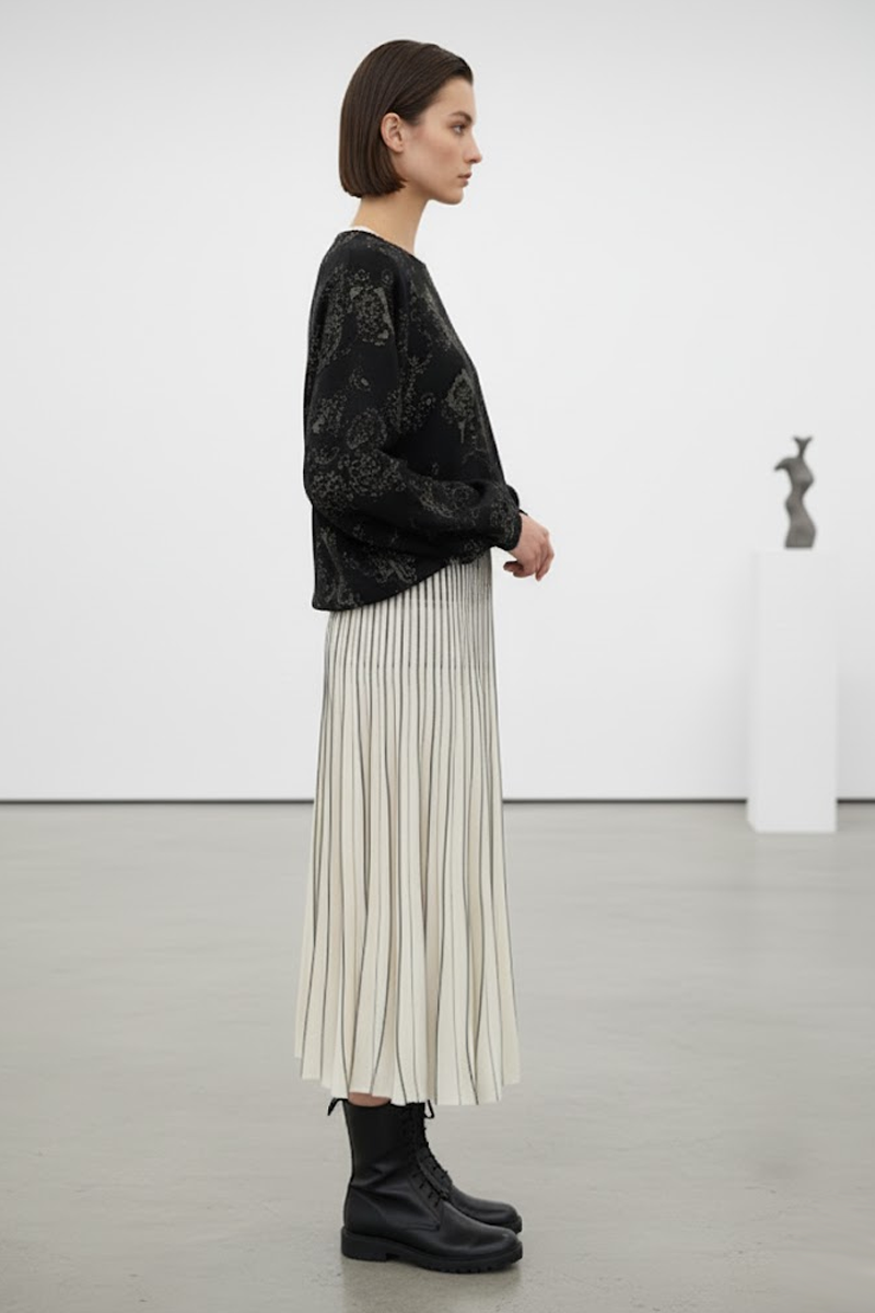 Son plissé délicat apporte du mouvement et de la légèreté, tandis que sa coupe midi flatte toutes les morphologies. Parfaite pour les journées fraîches, elle se porte aussi bien avec des bottes hautes qu’avec des escarpins pour une allure plus citadine.