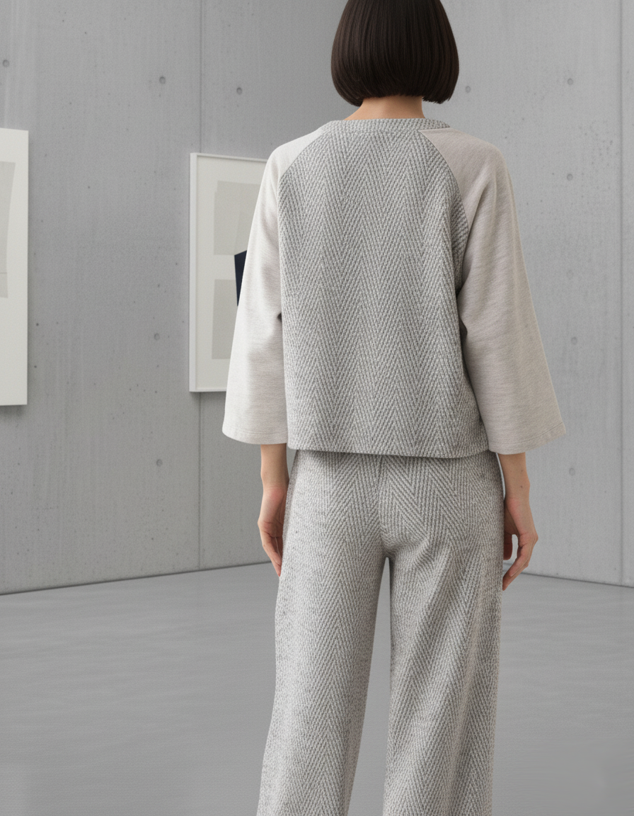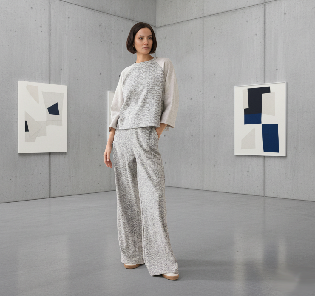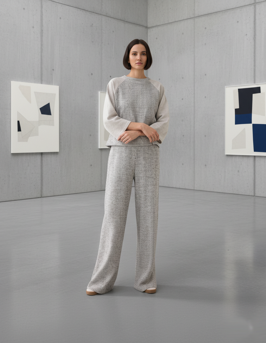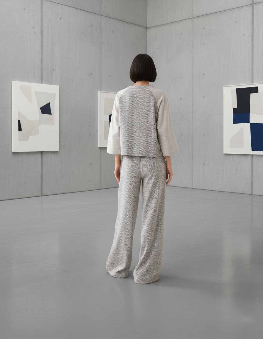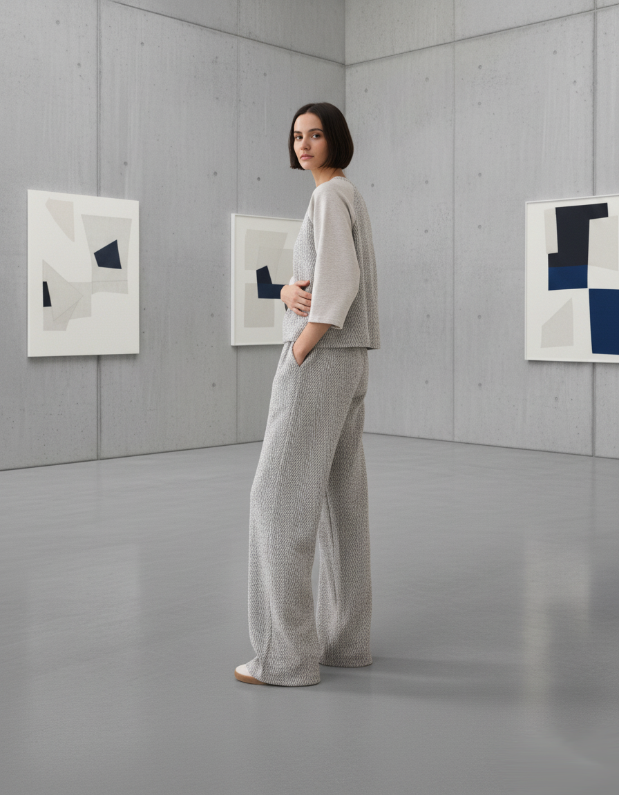 Ce pantalon à jambes larges en jacquard chevron incarne l’élégance contemporaine. Sa coupe ultra féminine et son tissu luxueux offrent une allure sophistiquée tout en garantissant un confort absolu. Le jacquard épais et souple révèle un motif chevron subtil dans des tons gris raffinés. Sa taille haute élastiquée épouse la silhouette avec douceur, tandis que les poches discrètes et les jambes très larges ajoutent une touche mode affirmée.