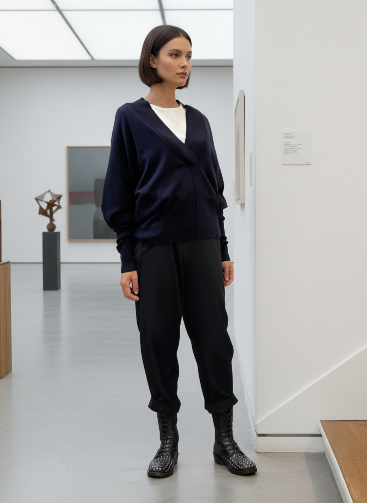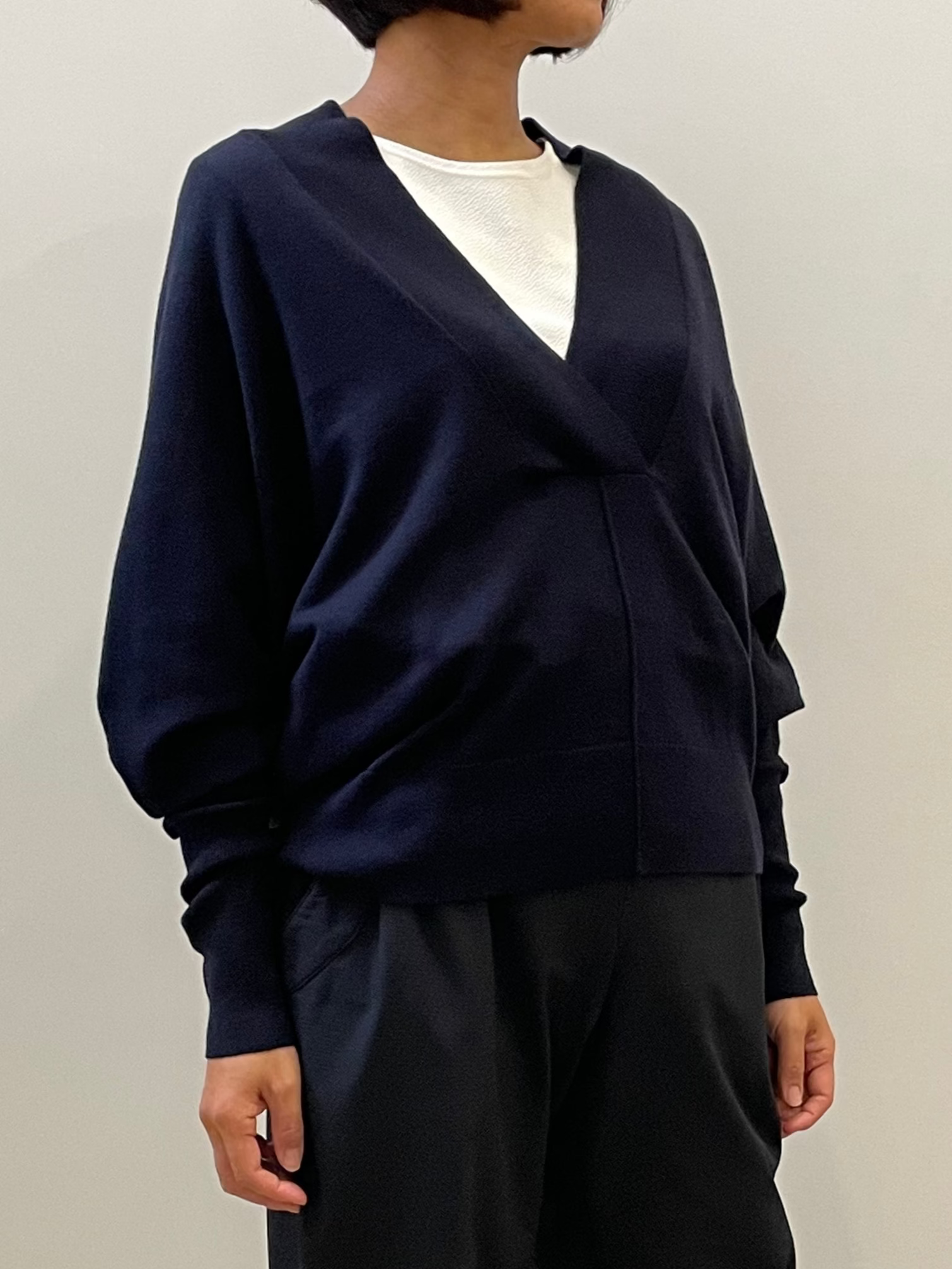 Ce pull ample est tricoté dans un luxueux fil de laine et de coton et présente des coutures à l'envers devant et au dos. Il présente un col V profond et des manches chauve-souris.
