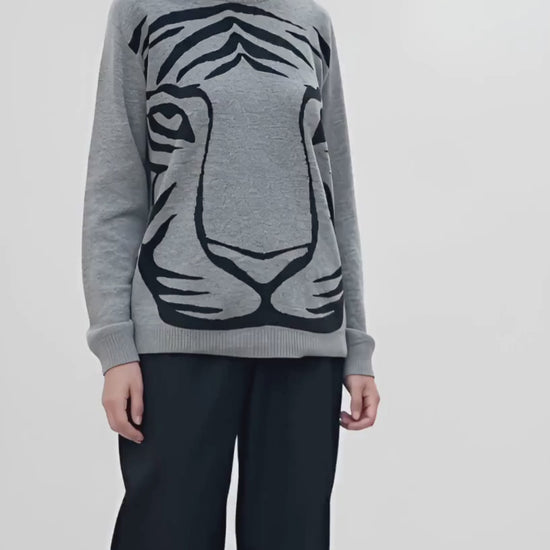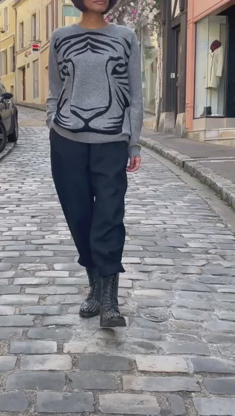 Son coloris gris moyen est rehaussé par une intarsia noire en forme de tête de tigre sur le devant, pour une allure graphique et contemporaine. Sa coupe classique et ses finitions côtelées au col, aux poignets et à l’ourlet assurent un tombé impeccable et un confort optimal.