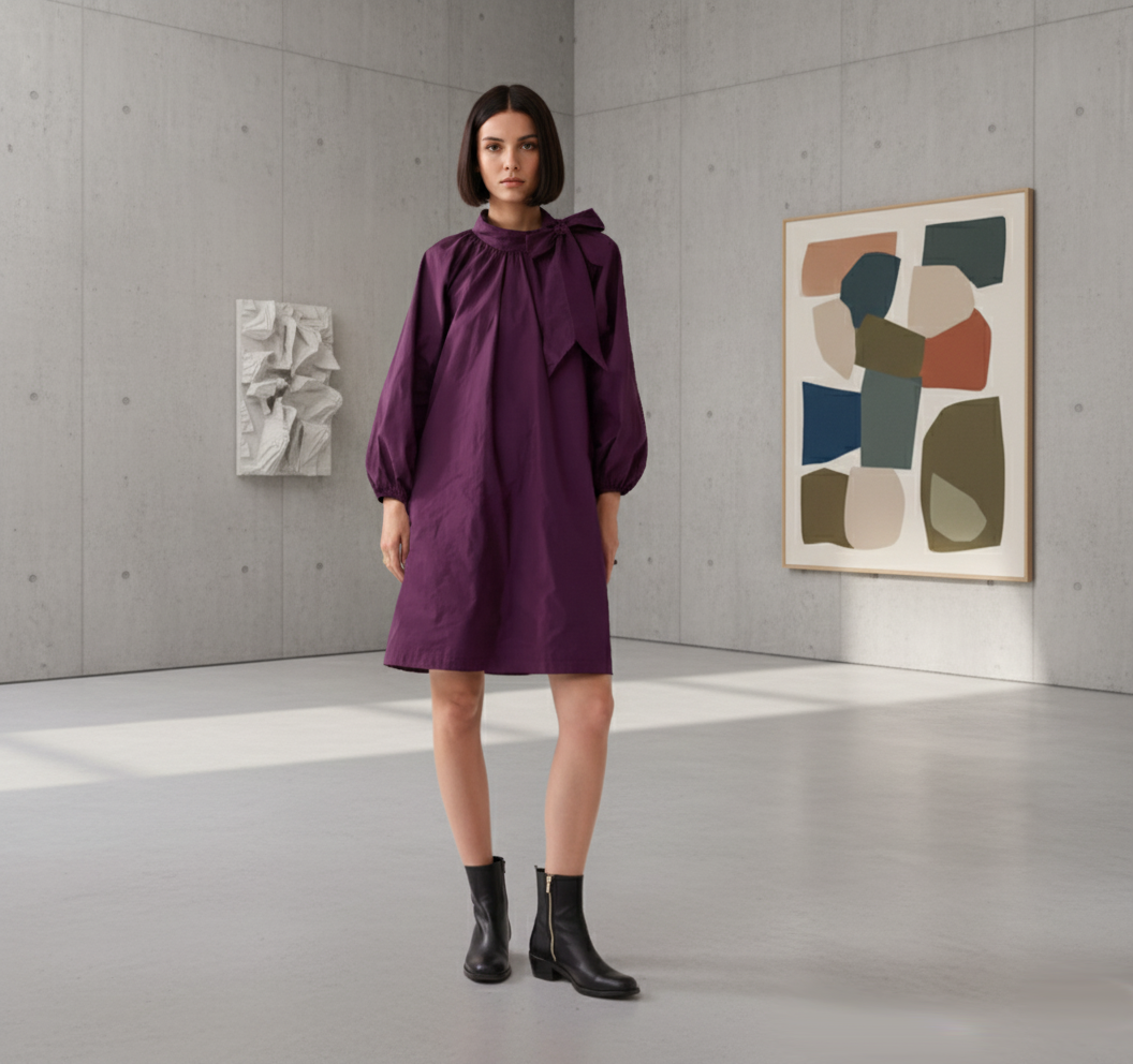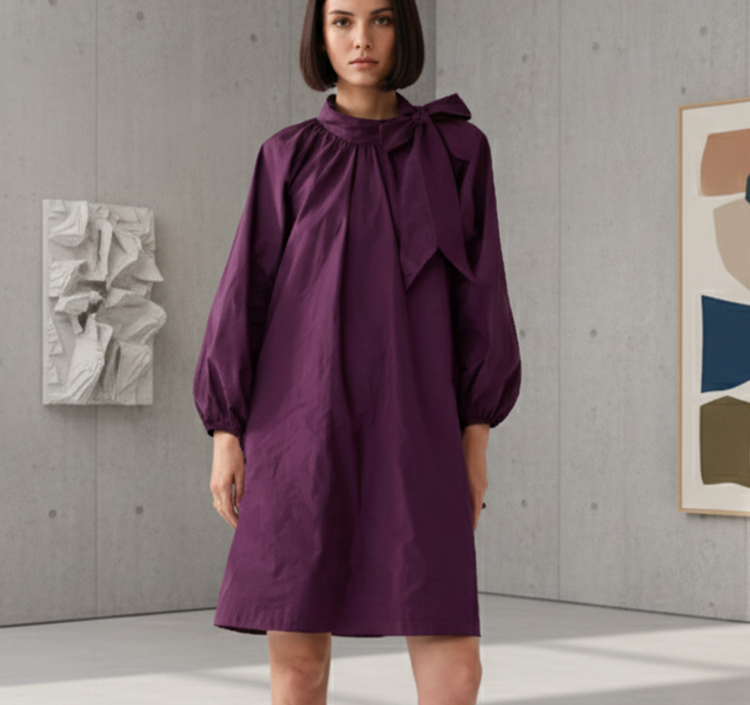 Affirmez votre style avec cette robe trapèze en taffetas couleur wineberry, à la fois audacieuse et raffinée. Sa coupe ample et fluide épouse les mouvements avec légèreté, tandis que le tissu structuré apporte du caractère à la silhouette. Le col froncé orné d’un nœud délicat ajoute une touche romantique, contrastée par les manches raglan bouffantes et les poignets élastiqués pour un effet volume maîtrisé.